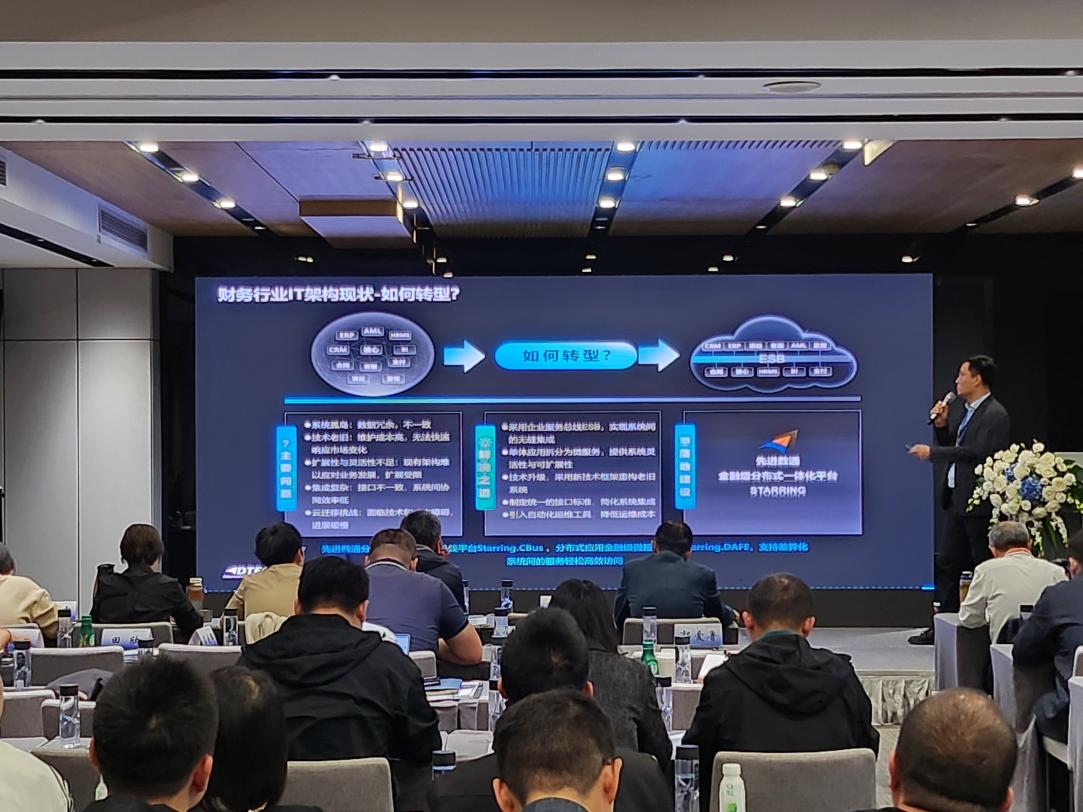 MG冰球突破官网代表讲师郭钰以《昆仑与MG冰球突破官网ESB解决方案助力财务行业创新与架构转型》为主题作发言分享。他深入剖析了当前财务行业IT架构面临的挑战,包括系统孤岛、技术老旧、扩展性不足等问题,并提出了基于企业服务总线(ESB)和微服务架构的转型方案。